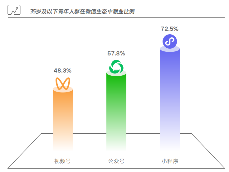 从调研情况看,72.5%的微信小程序从业人员年龄在35岁或以下,而公众号和视频号从业人员中这一群体的比例分别为57.8%和48.3%。数字生态繁荣、进入门槛低、经营成本低是创业者选择微信生态的主要原因。