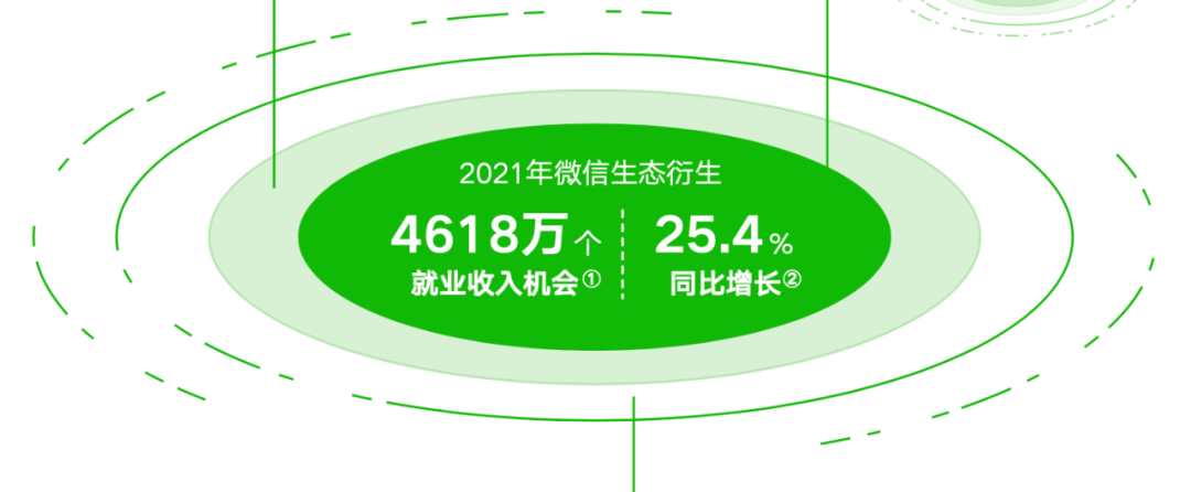 随着移动互联网日益普及,人工智能、大数据、云计算等技术快速发展,加快了企业数字化转型步伐,数字生态催生了大批新职业、新岗位,数字化就业快速崛起。《报告》显示,以微信公众号、小程序、视频号、微信支付、企业微信等共同构成的微信数字生态,在 2021 年衍生的就业收入机会[1]达到 4618 万个,同比增长 25.4%[2]。